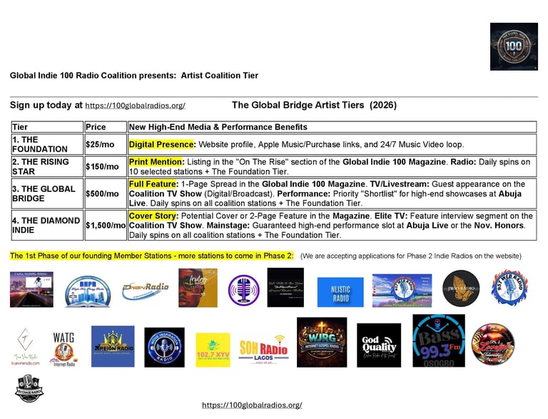 Imagine your career with this kind of power: Global Video Rotation: Your music video streaming 24/7 on our worldwide portal. Guaranteed Radio Airplay: Real spins on a network of 100 stations across three continents. TV Appearances: Feature segments on our syndicated Coalition TV & Radio Show. Print Authority: Get featured in the Global Indie 100 Magazine—the ultimate professional credential. The Big Stage: High-end performance slots at Abuja Live 2026 and the Indie 100 Honors.